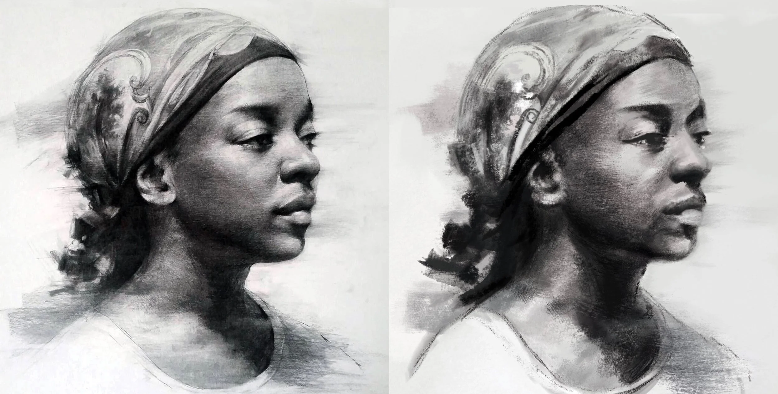 Photoshop master copy (right) of Woman with Scarf by Sookyi Lee (left).